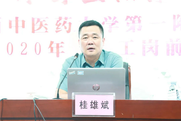 一附院党委书记桂雄斌首先对本次岗前培训的各项工作及取得的成效给予肯定。其次,通过分享一附院援鄂队员的先进事迹,向广大新员工展示了广中医人悬壶济世的责任担当以及不求名利,舍己为人无私奉献的优秀品格。最后,桂雄斌书记对新员工提出寄语和要求,希望大家在未来能不忘初心,刻苦专研,不畏困难,勇于担当,成长为“敬佑生命、救死扶伤、甘于奉献、大爱无疆”的良医、名医、大医!