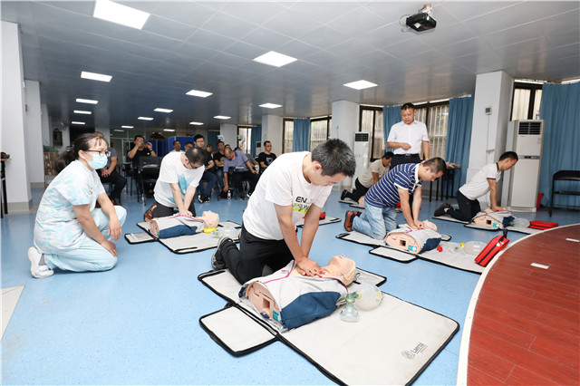 此次培训由医院医务部主任郑东林、重症医学科主任伍民生、急诊科主任欧阳国林等多位专家进行授课指导,培训严格执行AHA基础生命支持(BLS)课程标准,在观看视频的基础上,进行“互动式”“边看边练”的课程学习,培训内容主要有单人、双人施救者成人BLS,儿童、婴儿BLS,自动体外除颤器(AED)的使用,成人和儿童的窒息解除等等。
