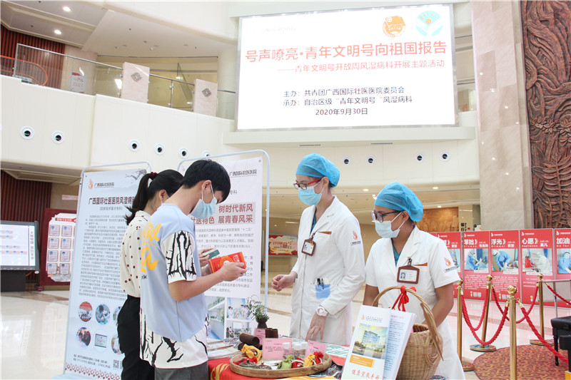 自治区级“青年文明号”风湿病科将“青年文明号”活动与加强青年培养相结合,努力打造一支“青春心向党 建功新时代”的青年医护人员团队。9月30日下午在医院门诊大厅开展2020年青年文明号开放周活动,风湿病科青年文明号号长及科室青年在门诊分发科室的宣传册,对患者及其家属进行疾病的科普与讲解,使患者及其家属对疾病有更加正确的认识与了解。宣传展示台布置了一些壮医特色的物品,如:竹罐、绣球、膏药等,进一步宣传了壮医药特色疗法,弘扬民族医学,充分体现了风湿病科创建青年文明号的口号:服务创一流,一切为病人。