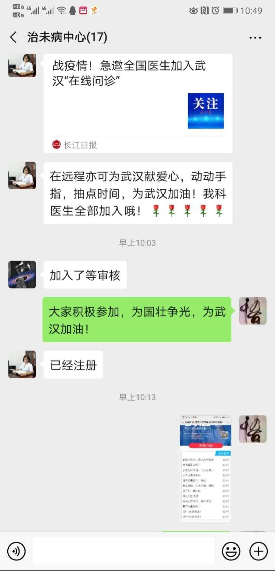 个人的力量总是有限的,为了帮助更多的人,王强主任在治未病中心和健康管理中心科室微信群内号召全科室医生加入到志愿者行列。