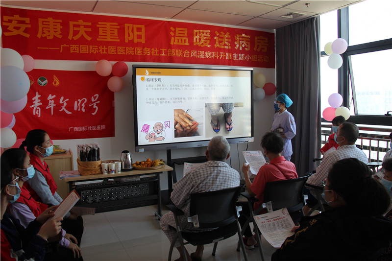10月23日下午,重阳节将至,附属国际壮医医院医院医务社工部联合风湿病科开展“安康庆重阳,温暖送病房”主题小组活动,本次活动由医务社工部工作人员主持,风湿病科医护人员和志愿者协助,旨在通过活动,帮助患者丰富住院生活,缓解治疗期间的焦虑不安心理,改善患者就医体验,让住院的病人及家属能够感受到医院的关爱。