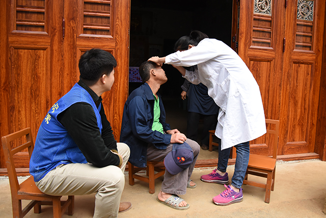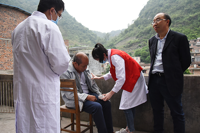 在义诊活动现场,各科专家克服路途劳累来到等候多时的村民们之间,耐心细致地聆听病情描述,仔细地检查村民身体状况,开具药方,针对预先调查得知的当地常见病和多发病,专家们还就健康饮食及日常应注意的事项等相关知识进行了专题讲解和普及。第一书记李金荣、吴汉周还带领医疗小分队走村入户,为患有眼疾、高血压、骨关节痛、肿瘤等疾病而行动不便的多位村民上门诊治。同时,按照医院“一帮一联”帮扶活动安排,专家们还代表党总支党员为村卫生所及建档立卡贫困户送上药品和慰问金。
