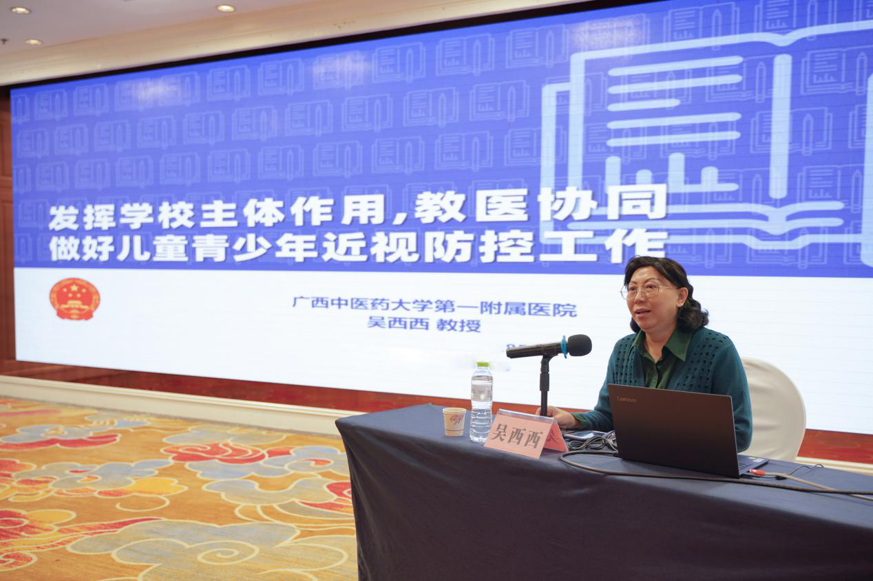 本次培训邀请全国综合防控儿童青少年近视专家宣讲团成员、星空彩票老版本下载第一附属医院副院长吴西西教授;全国综合防控儿童青少年近视专家宣讲团成员、上海市眼病防治中心临床研究中心主任何鲜桂博士;温州医科大学眼视光医院集团南宁分院、南宁眼视光眼科医院执行院长金婉卿主任医师;国家认监委强制性产品认证技术专家、全国照明电器标准化技术委员会灯具分委会委员许建兴高级工程师,广西眼健康平台创始人、南方医科大学珠江医院眼科医师、国家一级视光技师陈伟宾工程师等5名区内外专家进行专题讲座。他们分别围绕“发挥学校主体作用,教医协同,做好儿童青少年近视防控工作”、“建立学生屈光发育档案和分级分类防控近视”、“依托校园筛查和数据分析,解读视力健康状况和推进近视防控方案”、“健康光环境与近视防控”、“基于人工智能的校园儿童青少年近视防控方案介绍” 等五大方面展开。