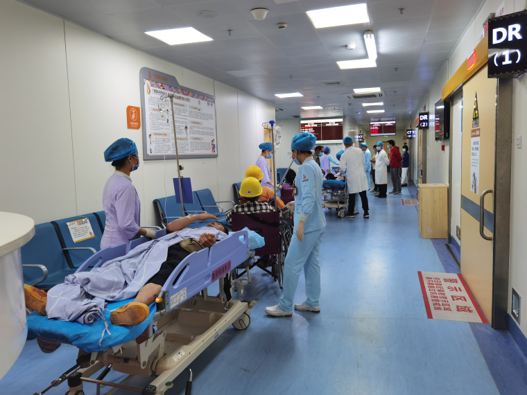 伤员到达急诊急救联动中心后,医护人员立即对伤员进行分类、登记信息、测量生命体征… …6名伤情较重的伤员送入抢救室。