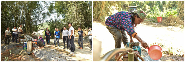 四联村地处卡斯特地貌的大石山区,六个自然屯里,只有旧旺屯是挨着更望湖,其余五个屯的饮水都只能各显神通。因此在每个屯里都建有大大小小的水柜,在干旱的季节只能是通过水柜收集的雨水来供人畜饮用。在谢虎的多方努力与后援单位的支持下,申请到了由一附院出资建设人饮工程,让用水难的问题得到了解决,该井于2019年11月4日成功出水,为该屯近500位村民解决饮用水问题,结束了村民们长期饮用雨水储水的历史。