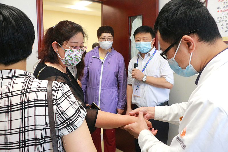 当天,调研组一行先后在门诊大厅、壮瑶药房、民族特色诊疗区、治未病中心等处实地参观调研广西民族医药建设情况,并亲身体验了壮医药线点灸等民族医特色疗法。
