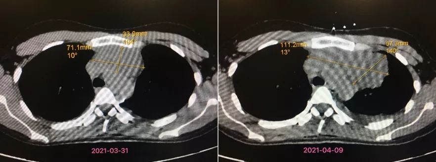 “一个多礼拜的时间里,患者的前纵隔肿物已经变大了很多。”心胸血管外科主任刘涛表示,经过前后两次CT结果的对比,患者的前纵隔肿物大小从71mm×34mm增长至111mm×57mm,增长迅速。