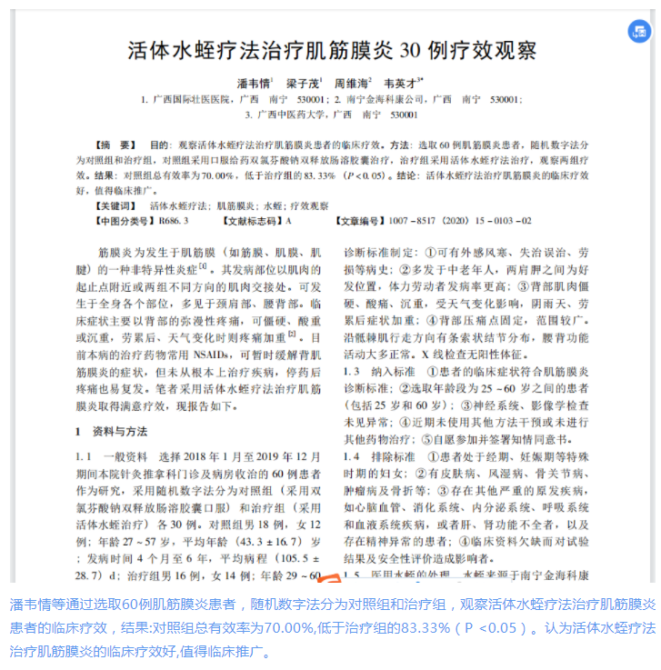 2008年以来,广西壮医医院(广西国际壮医医院明秀分院前身)对壮医水蛭疗法开展了深入挖掘和系统总结,进一步针对类风湿关节炎、痛风、臁疮、中风后遗症等优势病种的临床特征和病理表现,进行了大量临床探索和技术优化。