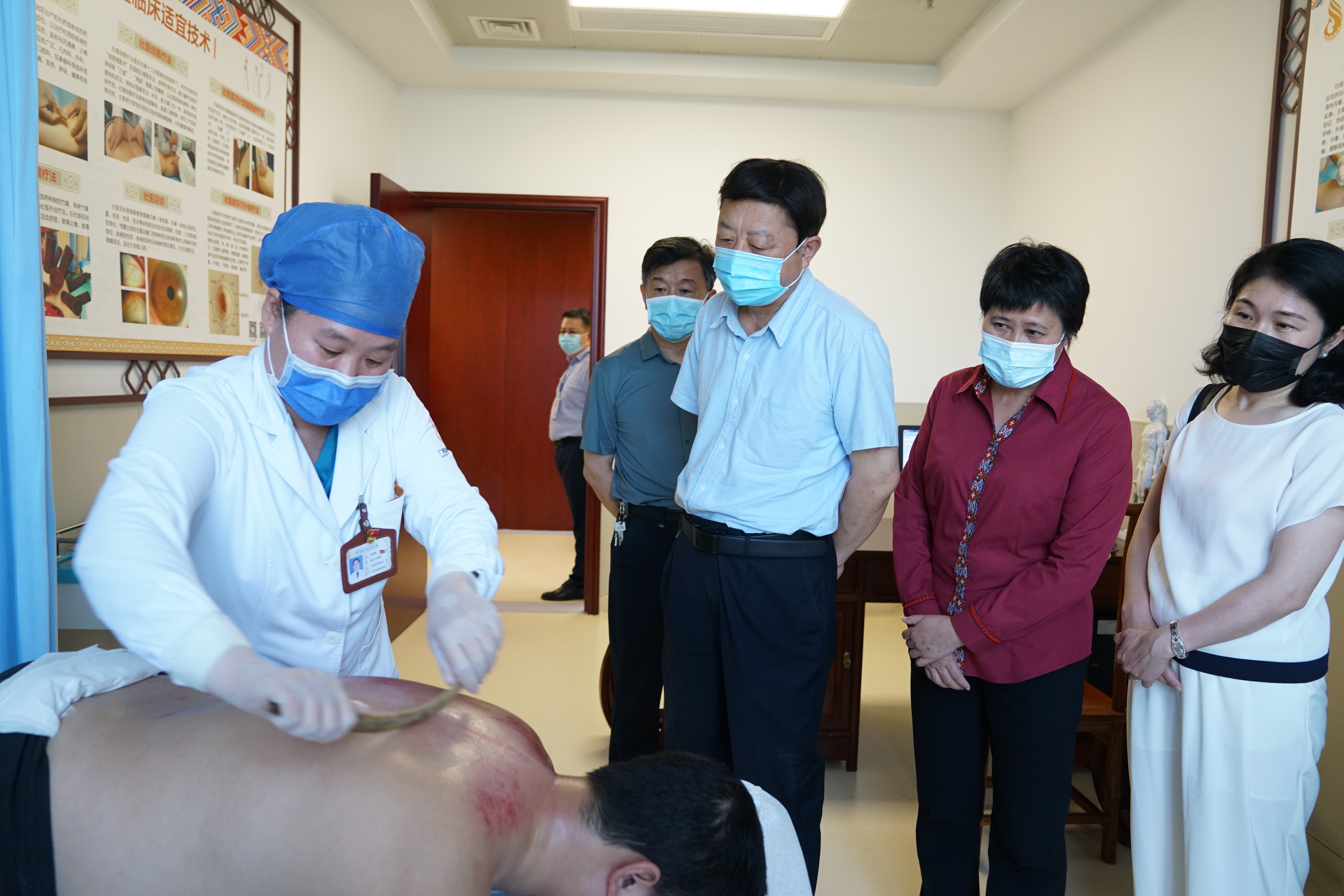 当日,刘耿一行先后到门诊大厅、药浴中心、治未病中心等处实地调研。在民族医学特色诊疗中心,调研组考察了壮医药线点灸疗法、壮医药物竹罐疗法、壮医脐环针刺疗法、壮医刮痧疗法等多种民族医技法,并与临床医生亲切交谈,深入了解国壮民族医技法的特色和疗效。