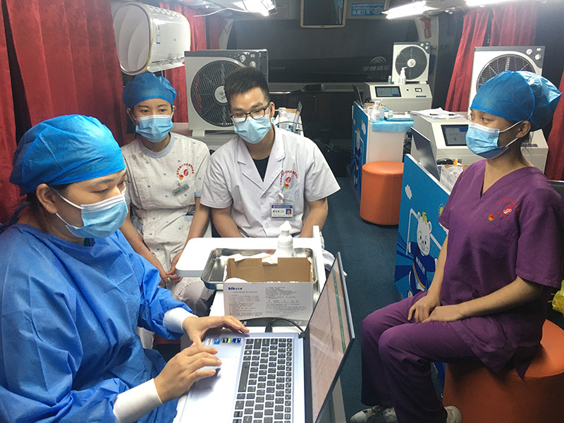虽然接种点是临时搭建的,但队员们每到一个地方都会严格地划分出问询区、登记区、接种区、留观区、急救区等区域,分工配合协作。五月的天气酷热难耐,队员们又穿着严实的工作服,因为接种车启动时会干扰疫苗接种工作,无法开空调,队员们只能在烈日下耐着高温“汗流浃背”地为群众服务。每天都是从清晨到深夜满负荷的工作,但是队员们都没有丝毫怨言,他们说:作为医护人员,必然已做好抗疫急先锋的准备,再苦再累,依然会出现在需要他们的地方!