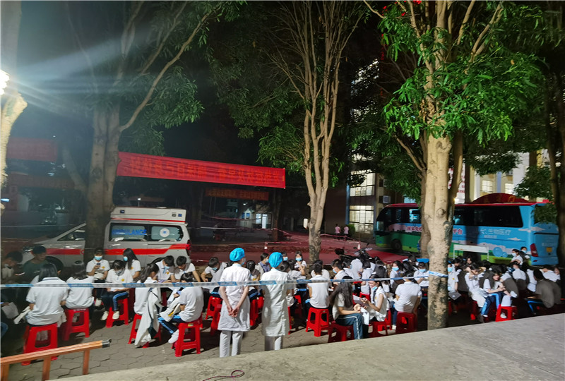 第一站接种任务完成当天,疫苗接种队匆匆返回崇左市,短暂休息后又来到了广西城市职业大学,开展全校师生一万余人次的疫苗接种工作,工作结束返回驻地时已是凌晨1时……