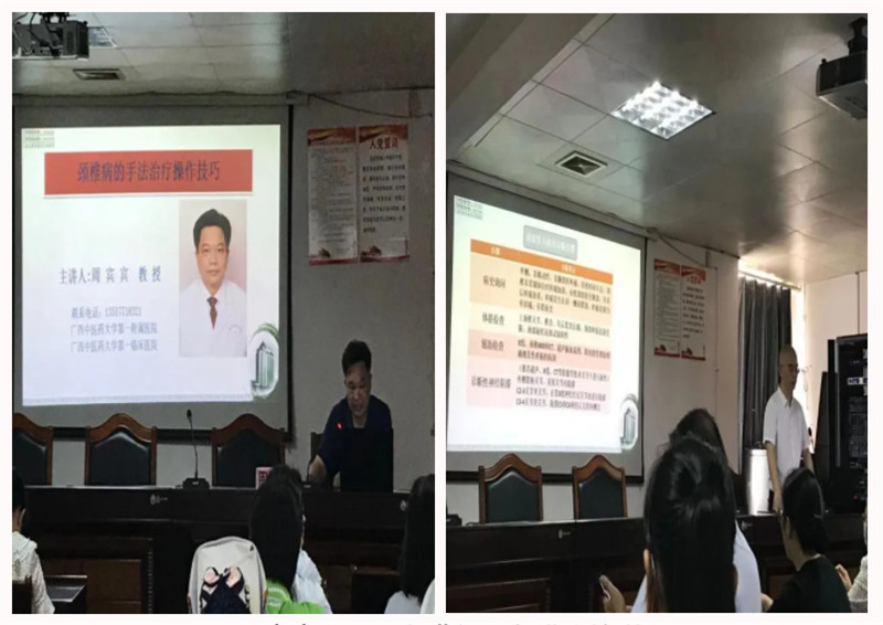 活动期间,周宾宾名中医团队与金秀瑶族自治县瑶医医院针灸推拿科全体医护工作人员一起进行教学查房、技术实操。在该院医护大会上,广西名老中医周宾宾与团队成员王开龙副主任医师、黄树武主治医师进行了业务培训讲座。一附院院长梁琼平、副院长徐敏玲以及各部门主任等都参与了活动。