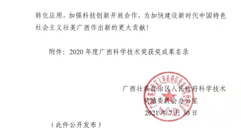 广西科学技术奖是广西科技界的最高奖项,每年奖励的是对广西科学技术进步、经济社会发展作出突出贡献的科技人员和组织。此次获奖是我院在省部级科技奖励方面的又一重大突破。