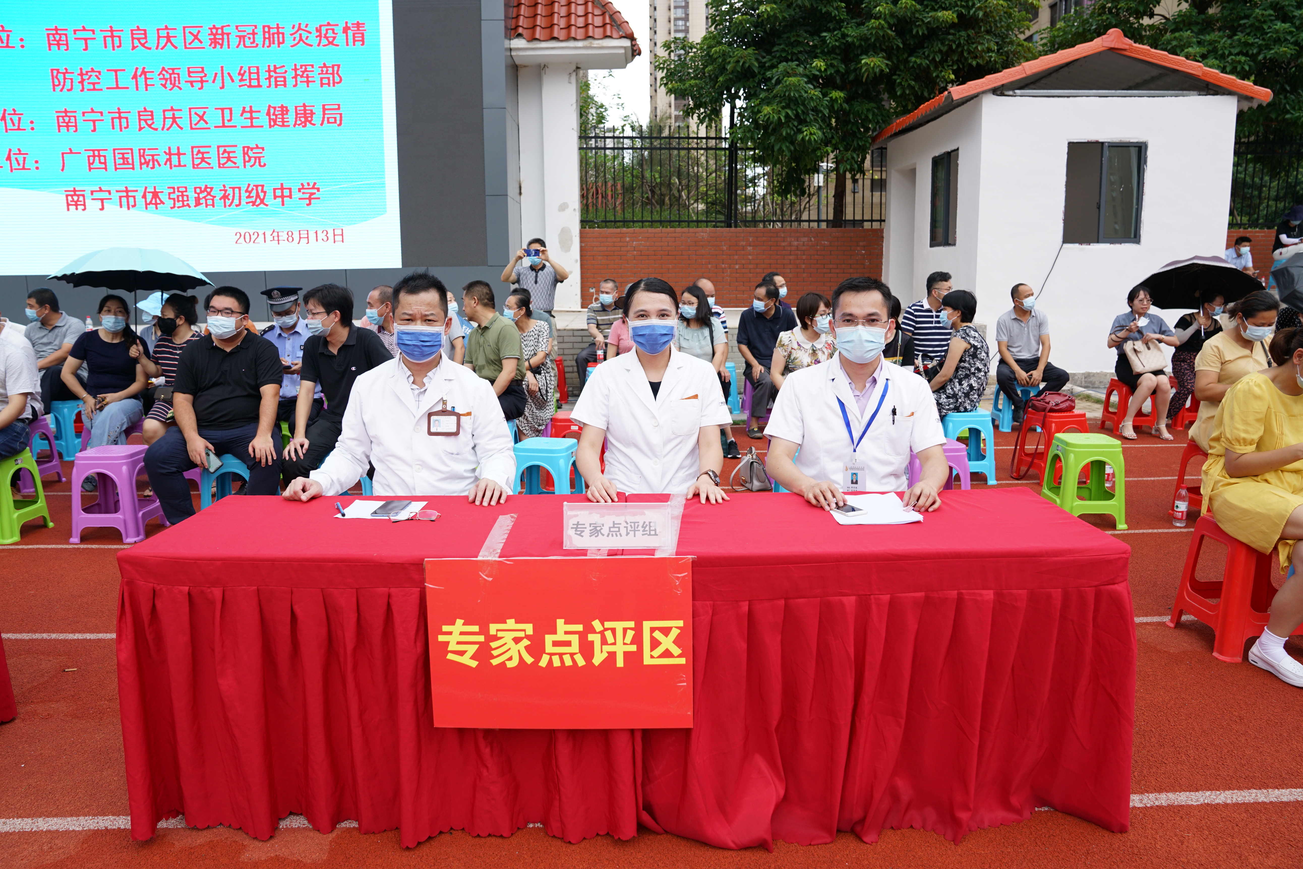 本次演练由南宁市良庆区新型冠状病毒感染的肺炎疫情控工作领导小组指挥部主办,良庆区卫健局承办,广西国际壮医医院、南宁市体强路初级中学协办。广西国际壮医医院医务部、感染管理办公室、感染性疾病科、急诊科等科室6名医务人员与良庆区各卫计所、卫生院、乡镇社区150名医护人员、群众共同参演。