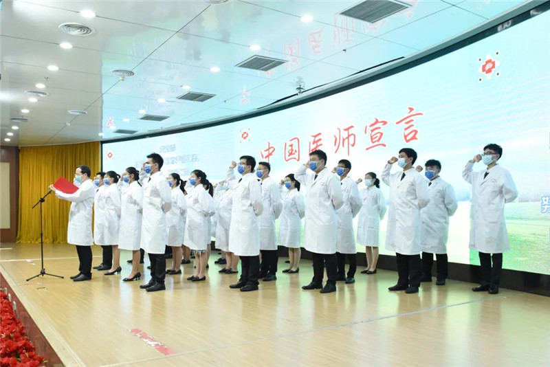 在一附院副院长卢健棋的领诵下,全体医师举起右手,用铿锵有力的声音郑重宣誓:自觉维护医学的尊严和神圣,敬佑生命,平等仁爱,患者至上,真诚守信,精进审慎,廉洁公正,终身学习,努力担当增进人类健康的崇高职责。以上誓言,谨记于心,见于行动。