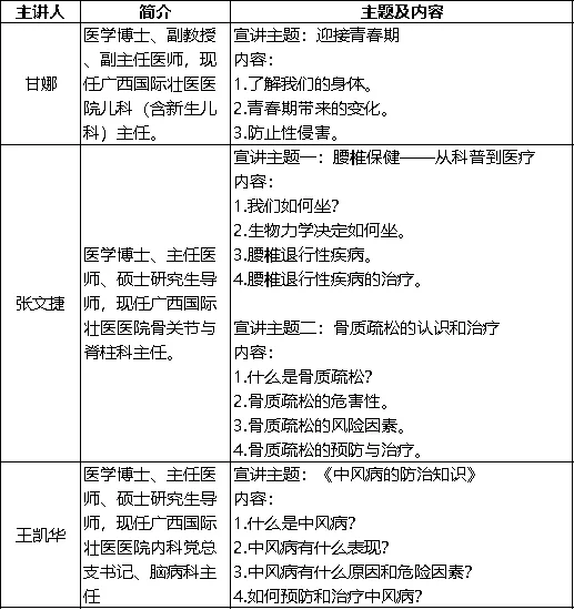 接下来,博士们将继续走进社区、企事业单位、社会团体及基层医疗机构开展科普宣讲。如果您所在团体有需要,快发送信息到“广西国际壮医医院”公众号后台预约吧!预约格式为:计划预约日期+预约的主讲人+预约主题+预约单位、联系人姓名及联系方式。
