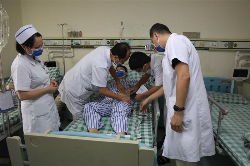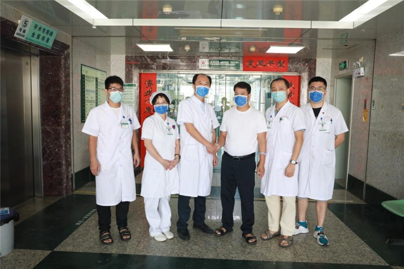 泌尿外科李峰主任及其团队在检查韦建才术后伤口恢复情况