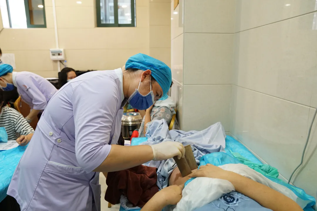 在技法体验区,骨关节与脊柱科医护人员将壮医药物竹罐、壮医药熨、艾灸等中医民族医技法带到了活动现场,为员工们治疗已病,预防未病。