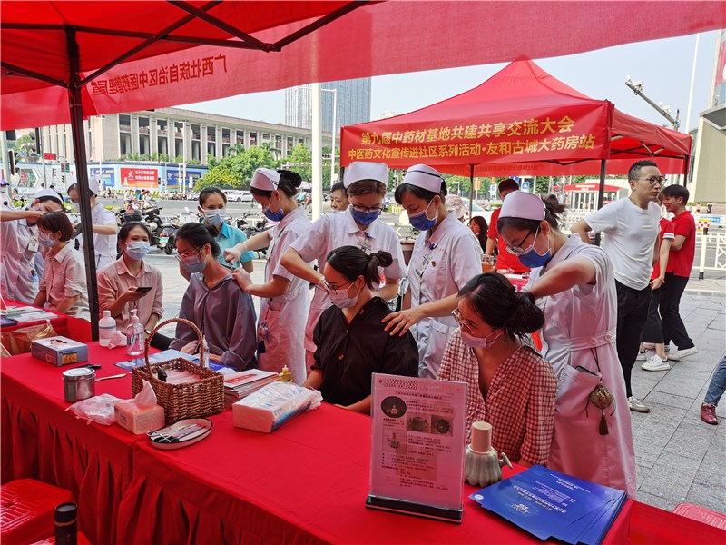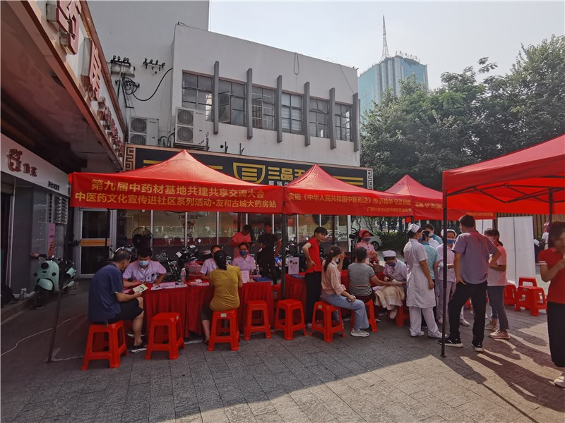 为进一步弘扬中医药文化,传播中医药知识,将中医药健康养生文化内涵转化为便于民众理解、掌握和应用的中医药养生方法,同时为东博会的召开和广西中医药事业发展提供强大的舆论支持和精神动力。第九届中药材基地共建共享交流大会——中医药文化宣传进社区系列活动第一站,9月12日在南宁市友和古城大药房(古城店)开展。一附院治未病中心谭良源、王艳,心胸血管外科郭艺贞护士长和仙葫脾胃肝病科秦娟文护士长共率领8名护理专家前往友和古城大药房开展中医药诊疗服务活动,服务300名余名社区群众。