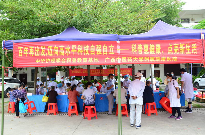 为响应中华护理学会及广西护理学会《关于开展2021年科普活动日活动》的通知要求,促进优质医疗资源下沉,深入基层引导文明健康生活方式,提高全民健康素养水平。9月16日上午,附属瑞康医院护理部组织骨伤科、肿瘤科、内分泌科、耳鼻喉头颈外科、老年病科、心血管内科、肾病科、妇涂、产科等多个专科的护理专家16人,联合田阳院区医疗护理专家团队10余人到百色市田阳区那坡镇,开展主题为“百年再出发,迈向高水平科技自立自强——科普惠健康,点亮新生活”的科普义诊活动。
