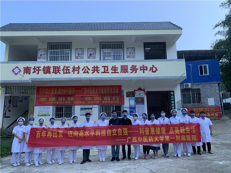 9月29日,在祖国72周岁生日来临之际,一附院第四十八批“轮值村医”团队如约来到联伍村,与以往不同的是,除了按计划当值的一附院机关三支部书记、护理部主任黄沂,脑病科副主任医师谭庆晶,内分泌科主治医师蒋云霞,脾胃病科医师胡静文之外,本次专家团队还包括了仙葫院区脊柱外科副主任覃浩然和苏宇虹、陈静、郭艺贞、周丽、曾嘉珍等医院专科护士一行16人,他们发挥自身所长,以中医特色护理技术为村民祛除病痛。