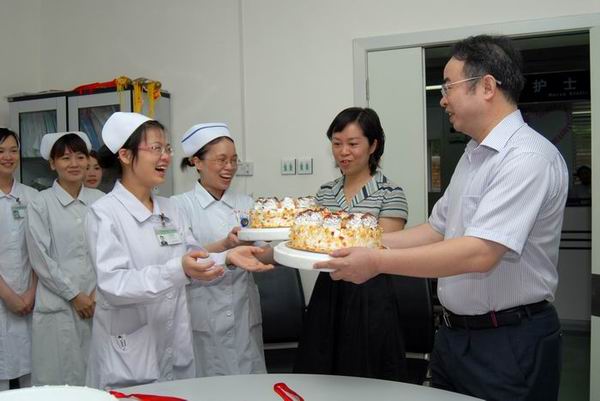 一附院黄贵华院长、李敏智书记一大早来到临床各科室,向节日里仍坚守在救死扶伤第一线的白衣天使们表示节日的慰问,并送上节日的蛋糕和祝福。医院党政领导感谢护士们用自己的辛勤劳动,换取了病友们的生命和健康,以“大医精诚”的优秀传统职业道德和南丁格尔精神,甘于奉献、忠于职守,构建了医院和谐的医患关系,促进了医院的和谐发展。在5.12国际护士节到来之际,医院党政领导班子表示,护理工作占了医院工作的三分天下,是医院医疗质量的重要组成部分,医院将会对护士们给予更多的关心和爱护,让护士们工作、生活更舒心、快乐!
