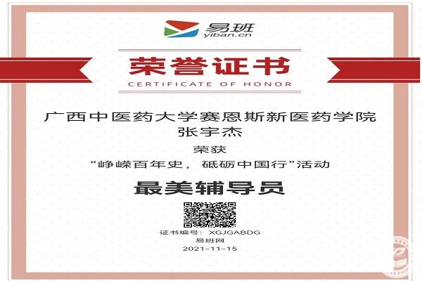 近日,在“2021年易班优课大学生党史学习知识竞赛”中,赛院张宇杰老师荣获“峥嵘百年史,砥砺中国行”活动“最美辅导员”荣誉称号。