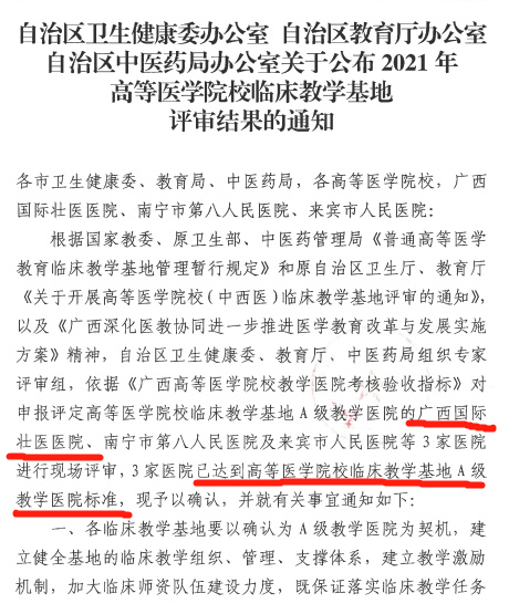 11月16日,自治区卫生健康委、自治区教育厅、自治区中医药局联合发文公布2021年高等医学院校临床教学基地评审结果,广西国际壮医医院通过高等医学院校临床教学基地A级教学医院评审。