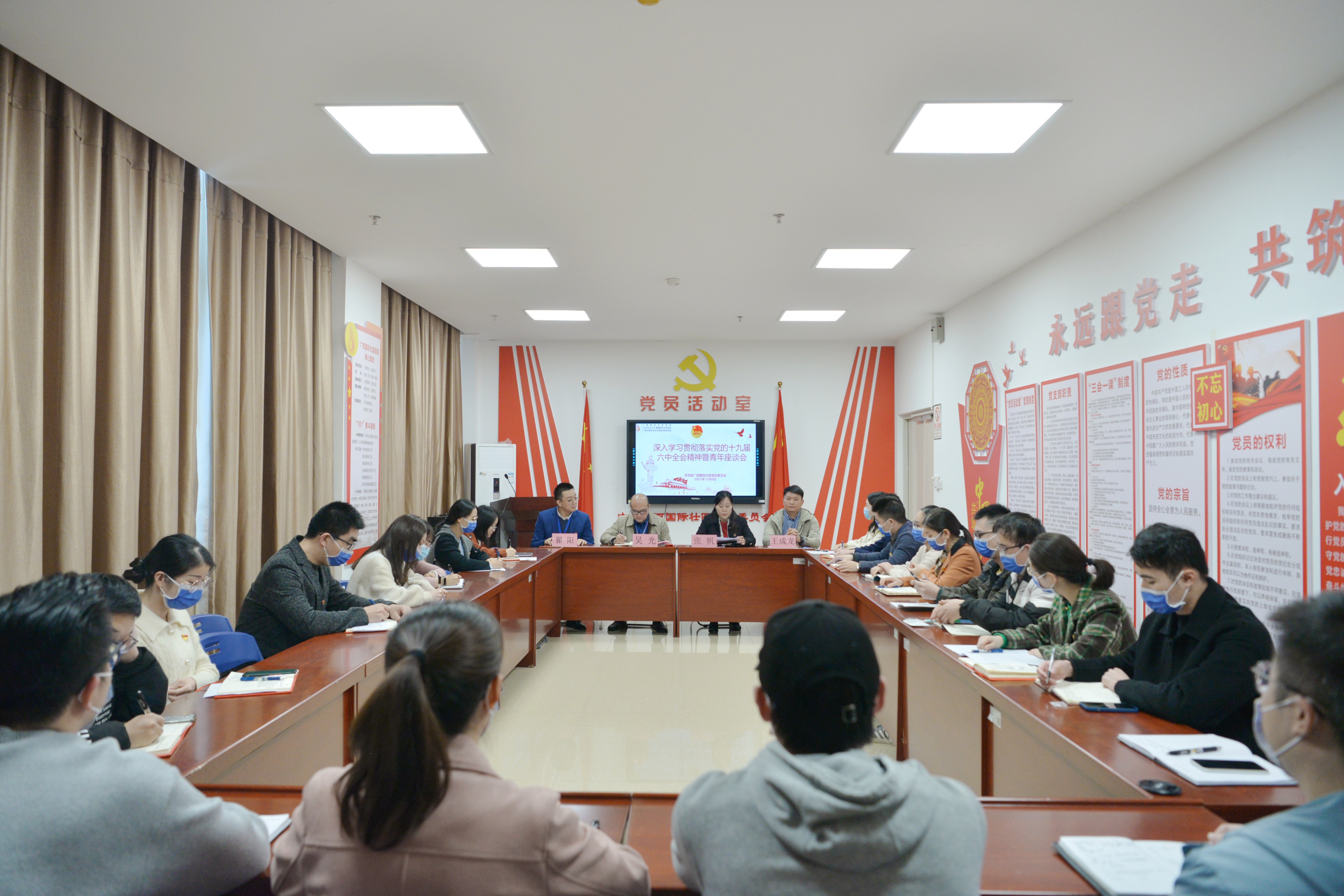 12月6日,附属国际壮医医院召开学习党的十九届六中全会精神暨青年座谈会活动。院党委副书记吴光出席活动,医院团委委员、团干部、青年代表30余人参加培训。院团委书记张帆领学《党的十九届六中全会精神》。会议由院团委副书记翟阳主持。