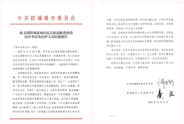 12月27日,中共防城港市委员会向一附院及支援防城港核酸采样工作队发来感谢信,感谢一附院在防城港最困难、最急需的时候积极伸出援助之手,派出150名医护人员,倾力帮助当地开展两城区全员核酸检测。
