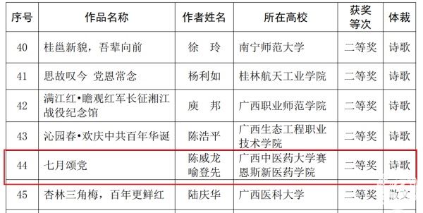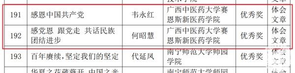 近日,在自治区党委教育工委公布的学习贯彻习近平总书记“七一”重要讲话精神“党员心声大家谈”暨“四史”学习教育主题征文比赛获奖名单中,赛院共有3篇征文获奖。其中,陈威龙、喻登先的诗歌《七月颂党》荣获二等奖,韦永红的体会文章《感恩中国共产党》、何昭慧的体会文章《感恩党 跟党走 共话民族团结进步》荣获优秀奖。