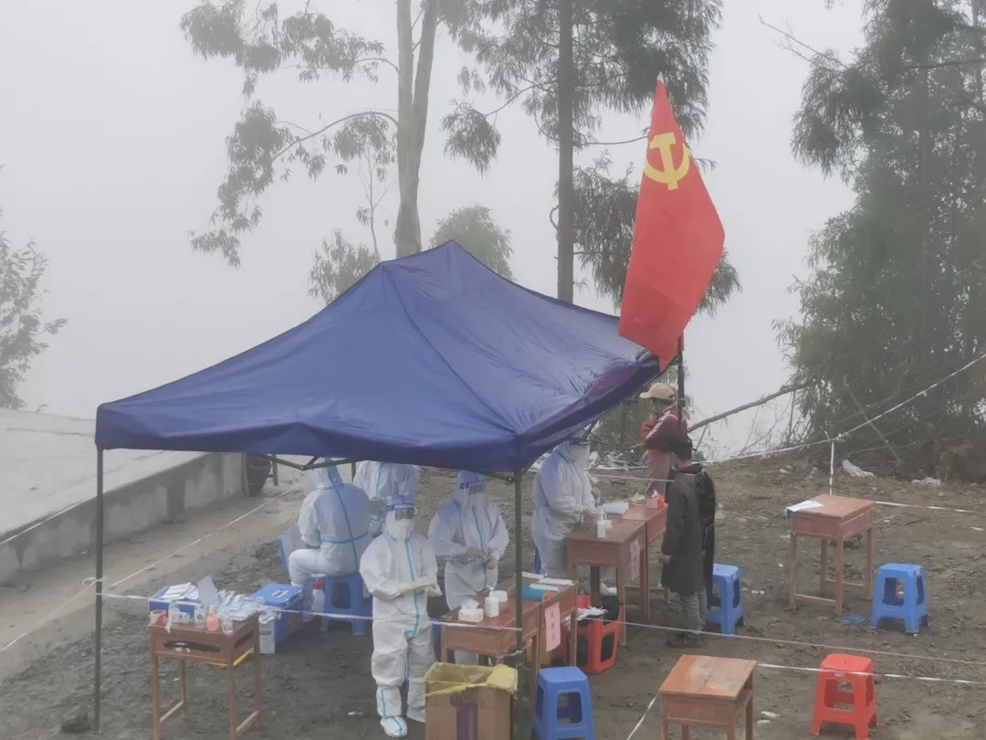 本以为完成百色市最远的泮水乡的核酸检测任务就已经很有挑战性了,没想到百计屯更甚。大巴车、面包车、货车几经辗转,山路狭窄、湿滑,山顶云雾笼罩……“不管如何危险、怎么艰难,我们的党旗还是插到了山顶上,按时、按质完成了1000多人的核酸采样任务。”梁亮说。