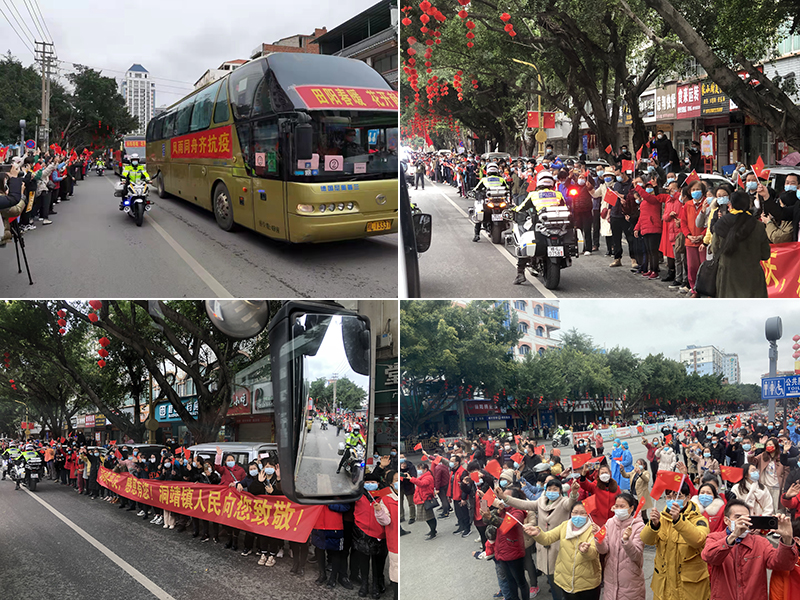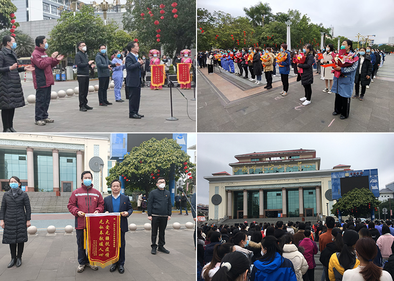 今天,我们的英雄回家啦!上午10点,百色市田阳区委、区政府为队员们在布洛陀广场上举行了欢送仪式。百色市田阳区委书记黄国哲为队伍赠送了写着“大爱无疆抗疫情 无私奉献暖人心”的锦旗与鲜花。