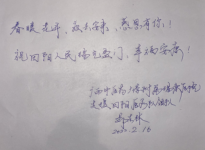 队伍在离开前,百色市田阳区田州镇那塘村村支书代表全体村民向队员们送来村民手写的墨迹还未干透的感谢信,感谢队员们日夜坚守,为父老乡亲筑起健康安全防线。