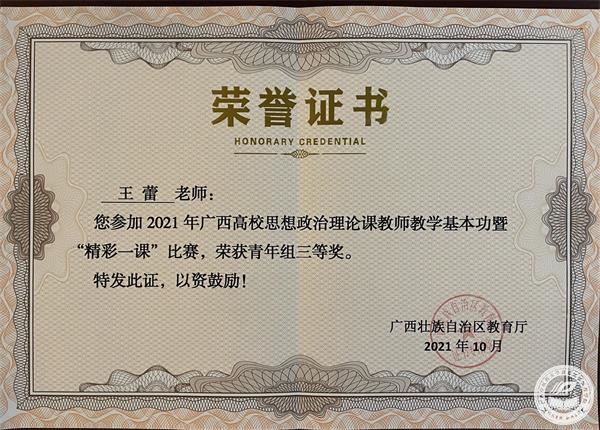 近日,从《自治区教育厅关于公布2021年广西高校思想政治理论课教师教学基本功暨“精彩一课”比赛获奖名单的通知》(桂教思政〔2021〕27号)获悉,在由自治区教育厅主办的2021年广西高校思想政治理论课教师教学基本功暨“精彩一课”比赛中,赛院思政部王蕾老师荣获2021年广西高校思想政治理论课教师教学基本功暨“精彩一课”比赛青年组三等奖。