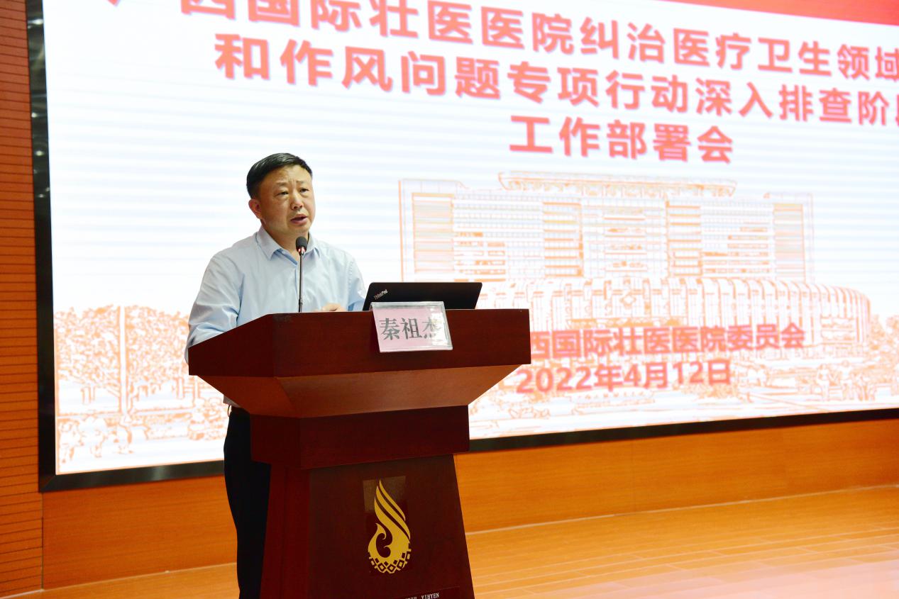4月12日下午,广西国际壮医医院召开纠治医疗卫生领域腐败和作风问题专项行动深入排查阶段工作部署会。医院党委书记秦祖杰传达全区纠治医疗卫生领域腐败和作风问题专项行动深入排查阶段工作推进电视电话会议精神并讲话,院长岳桂华及在家院领导出席会议。