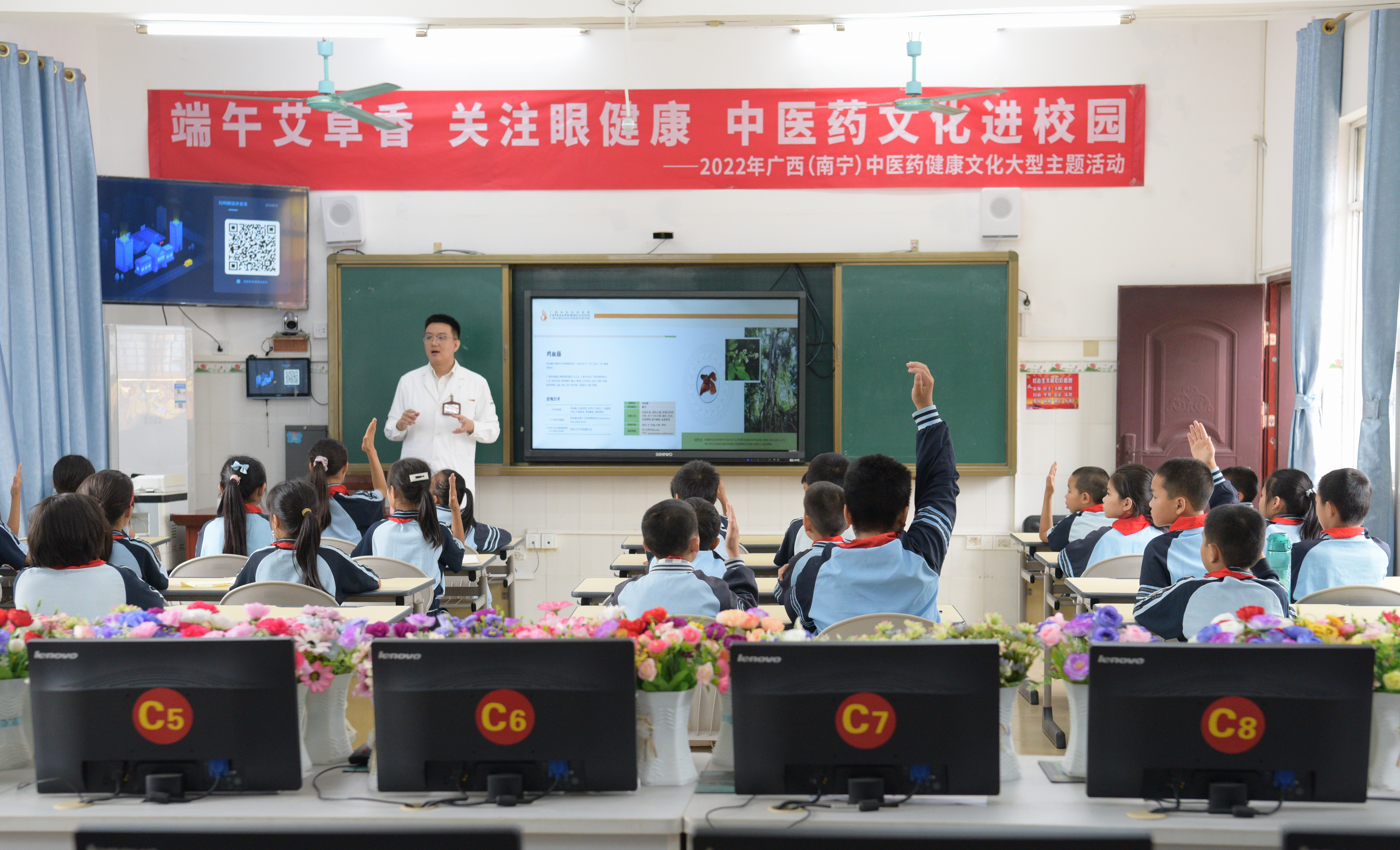 “大家知道艾草的由来吗?”“眼睛为什么能看见东西?”“哪位小朋友知道我们广西的‘桂十味’分别是哪十种药材?”在天堂村小学,一场精彩校园中医药文化主题活动正在进行。中医专家以“端午艾草香 关注眼健康”为主题,通过通俗易懂的语言,生动有趣的视频,简单易学的眼保健操,带领学生们进一步了解掌握中医药文化以及中医药日常护理小妙招。