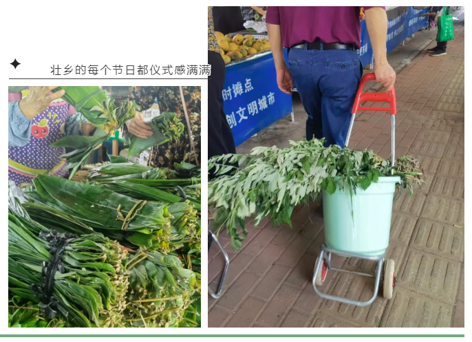 再说习俗,家乡除了挂艾草,孩童着五毒肚兜、戴艾草包,稍大点的孩子戴五色丝线,染指甲、吃粽子外,并无“兰汤沐浴”的习俗。再观壮乡地区,大约端午节前一个星期,菜市、马路边便有老农摆摊售卖新鲜的粽叶、艾草、菖蒲等,人们也一早就开始在摊位前选购,一则为端午节悬挂,二则为煮水洗浴。这与家乡孩童着五毒肚兜是一样的道理——驱毒辟邪。端午前后,壮乡人民家家户户都煮一大锅艾草水,拿来给孩子们泡澡,老人们说泡过艾草水整个夏天都不起痱子,身强体壮吃嘛嘛香。就连婴幼儿游泳馆,也把清水换成了“药水”,让孩子们尽享“药浴”,安过“恶月”。