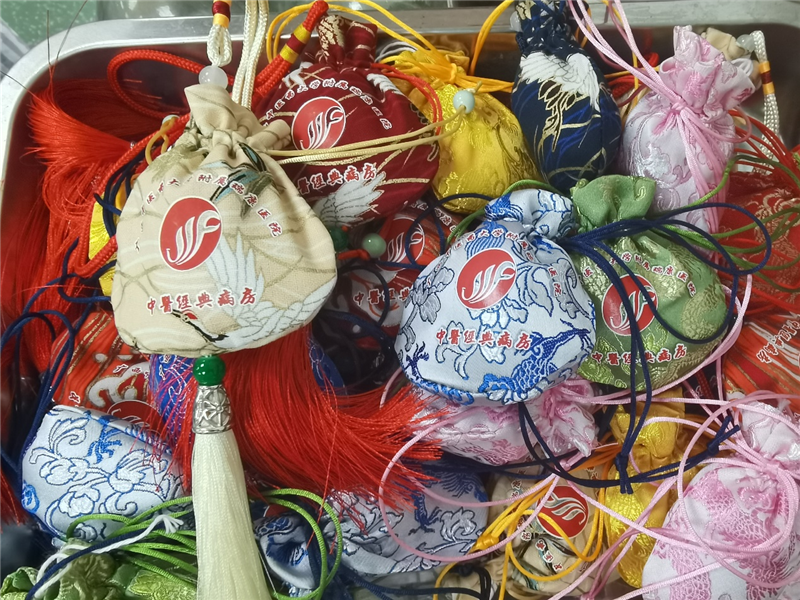 中药香囊常用的药材为艾叶、霍香等芳香类中药材。艾叶,气味芳香,具有温经止血,散寒调经,安胎等功效,我国民间端午历来流行挂艾叶、熏艾烟、洗艾澡以辟邪的习俗,在瘟疫流行时,更是悬挂艾叶、熏艾叶以防病。现代药理研究表明,艾叶所含有的艾叶油具有镇咳、平喘、祛痰作用。霍香,气味芳香,具有化湿,解暑,止呕等功效,现代药理研究证明,霍香具有止咳化痰,调节胃肠功能,免疫调节等作用。随身佩戴这样一个中药小香囊,晚间挂床头,每10-15天更换一个,使用四个周期,健康生活每一天!