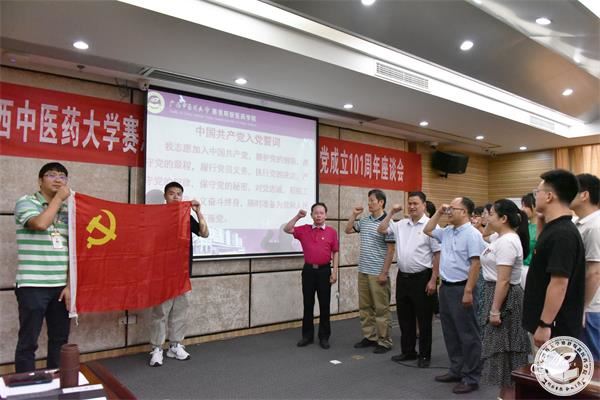 座谈会上,思政部教师代表姚垚、药学系教师代表黄茂春、辅导员代表张宇杰、学生党员代表江瑞杰先后发言,大家结合实际,深情回顾了党的光辉历程,分享学习习近平新时代中国特色社会主义思想以及习近平总书记到广西视察时的重要讲话精神的感悟体会,表达对党的无限忠诚与热爱之情,对推进学院高质量发展的坚定信心、决心。最后,与会人员一起重温了入党誓词。