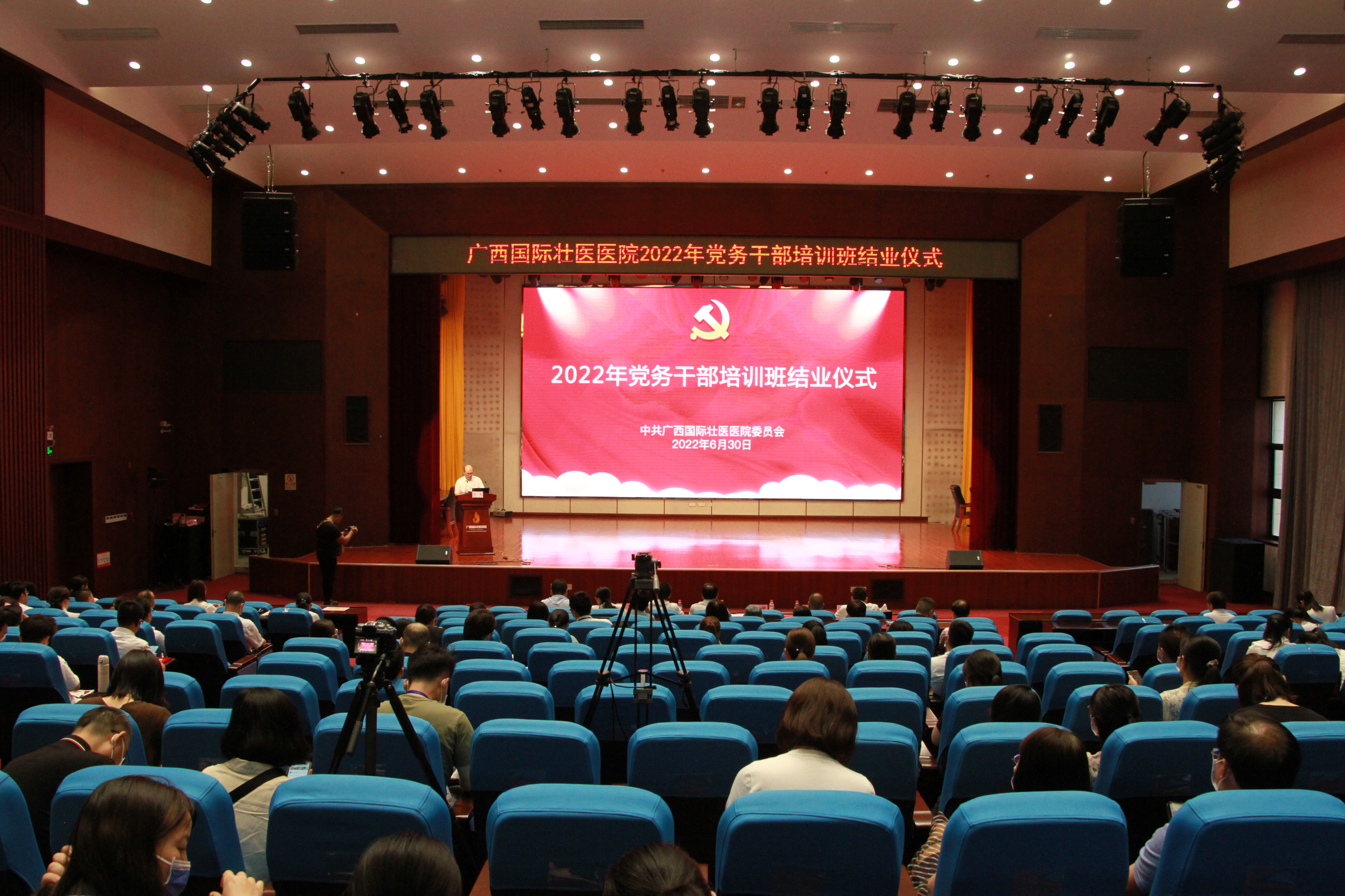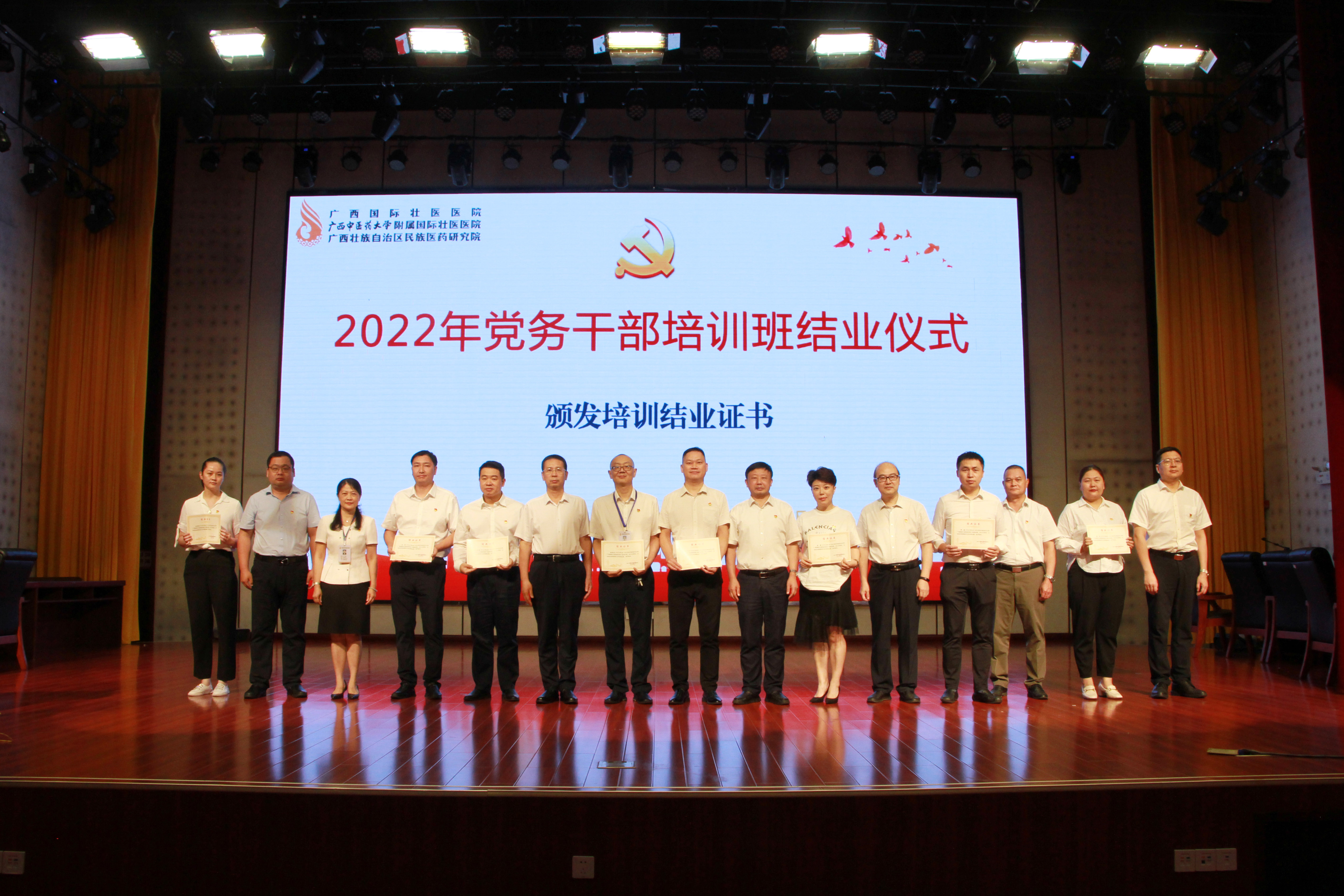 6月30日,附属国际壮医医院举行2022年党务干部培训班结业仪式,医院党委书记秦祖杰、院长岳桂华及在家院领导班子成员与会,并为学员代表颁发结业证书。