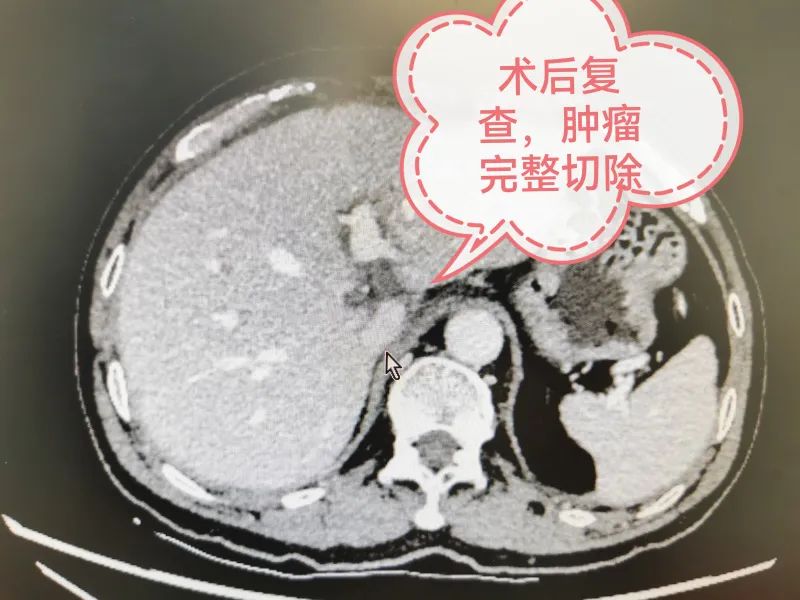 手术顺利开台,在被重要血管包围的狭小空间内,韦邦宁凭借丰富的外科手术经验,细致、精准的将肿瘤周围血管一点点游离,通过与手术助手、麻醉医师和器械护士的熟练配合,终于将肿瘤完全取出,术中出血量约100ml。
