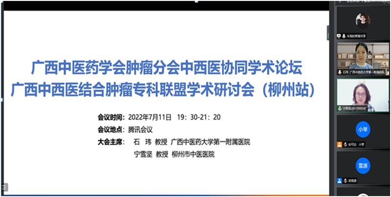 7月11日晚,为促进广西恶性肿瘤中西医协同诊疗的发展,以中西医结合肿瘤防治专科协作为纽带,不断提升中西医协同专科专病诊治能力和诊疗技术,广西中医药学会肿瘤分会中西医协同学术论坛暨广西中西医结合肿瘤专科联盟学术研讨会(柳州站)线上成功举行。由广西中医药学会肿瘤分会秘书、一附院肿瘤学科负责人、肿瘤科二病区主任石玮及柳州市中医院肿瘤科宁雪坚教授共同担任会议主席。