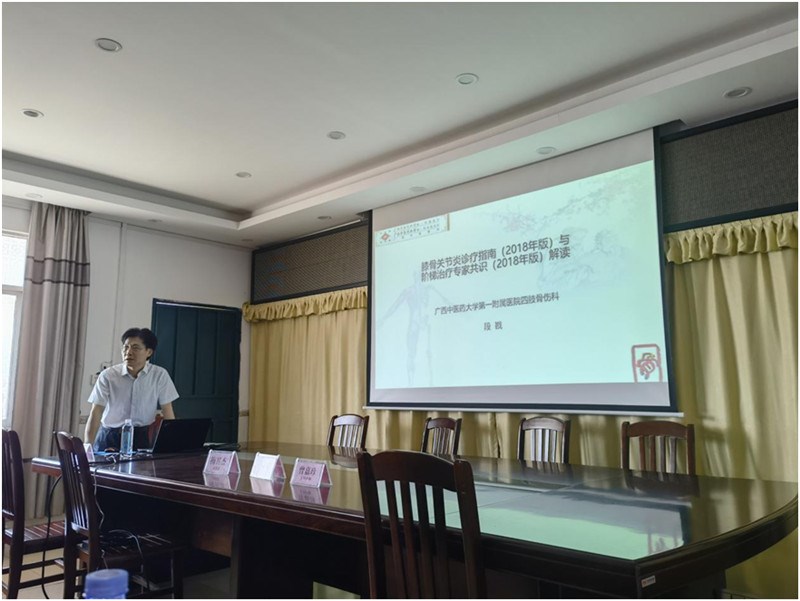 最后,段戡名中医团队4名成员为基层医护人员进行专科相关知识的授课。对骨科常见病膝关节骨关节炎的最新指南进行详细解读,对骨伤科常见并发症静脉血栓栓塞症、血管导管相关感染的预防与护理进行专题讲授。另外,就我院“2022年广西中医药适宜技术开发与推广项目” 的科研合作进行培训、推进,并结合我院极具特色的医院制剂十一方药酒的临床试验研究,对基层医院如何开展当地特色药物(壮药)的临床研究进行动员、指导。