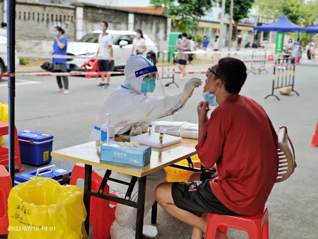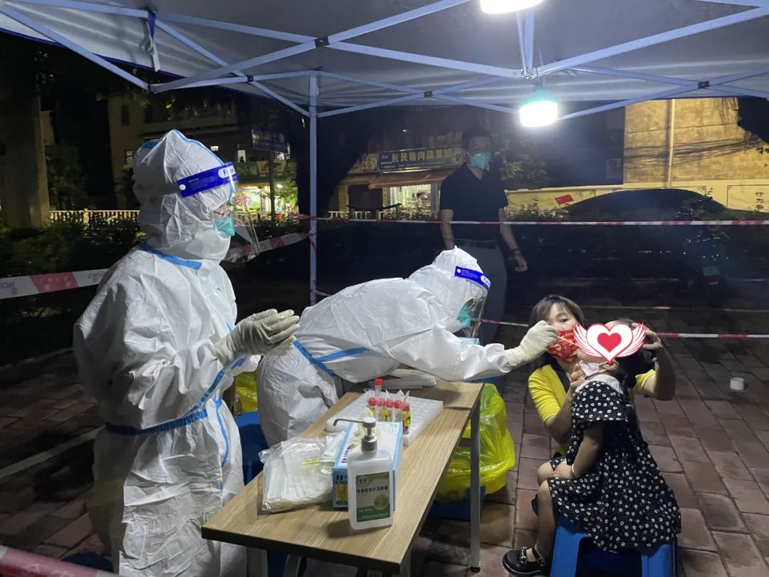 7月15日晚上8时34分,北海市地角社区沙坡街道。热风熏人,“大白”挑灯夜战,附近居民积极配合。支援北海的前两天,“大白”们每天工作到凌晨1时。