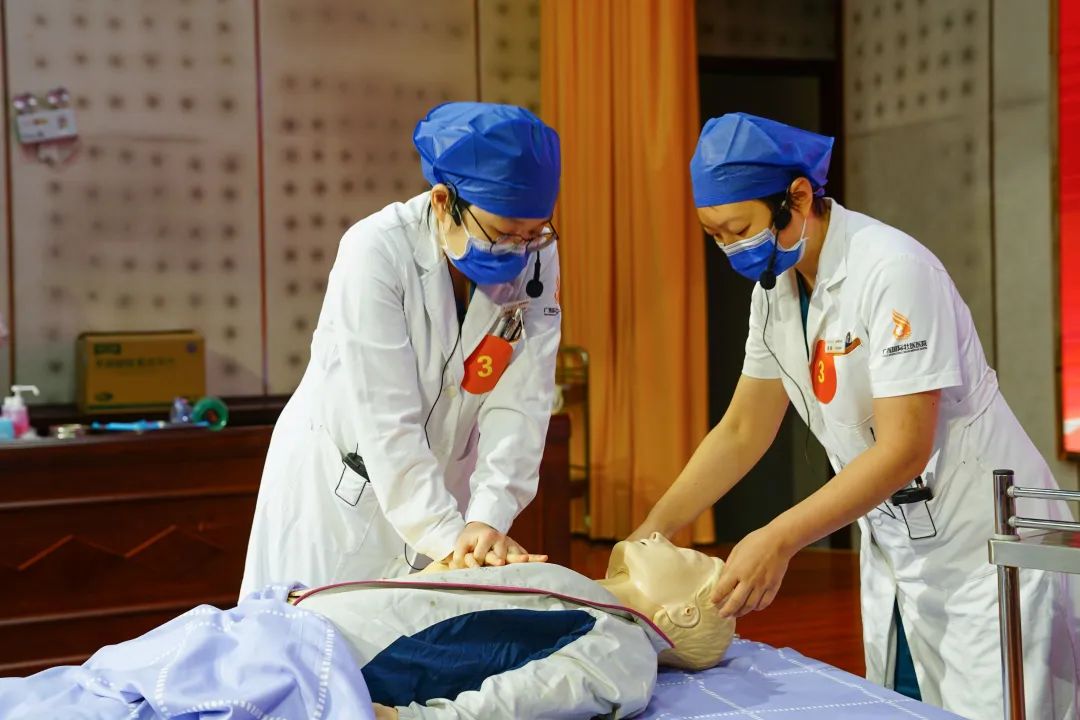 本次比赛,医师们需要在真实的模拟场景下,通过用物准备、评估病情、胸外按压、开放气道、人工呼吸等项目展示心肺复苏操作水平,评委们则从操作规范、抢救速度、配合程度等角度对医师们的表现进行评分。