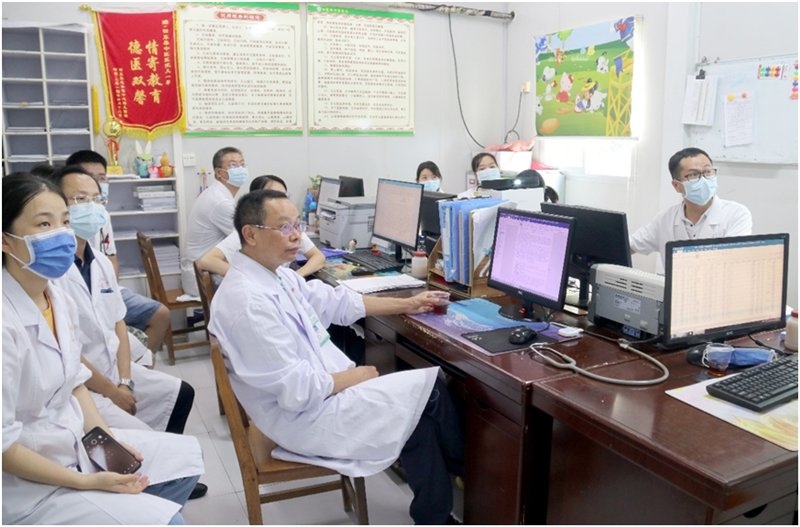 教学查房后,针对田东县中医医院的一疑难病例进行讨论,该患儿因发热入院,入院后查血常规提示血红蛋白72g/L,并且出现了不明原因的多器官功能损害,经多天治疗后患儿仍有反复低热、恶寒、头晕、乏力等症,故对此提出了讨论,在病例讨论过程中,各抒己见,当地医生各自表达自己的意见以及提出疑问,李伟伟及许靖教授针对患儿病史及目前病情提出下一步诊疗计划及诊断建议;李伟伟教授还从中医角度进行辨证论治,该患儿辨证属于气虚发热,予补中益气汤+石膏调节气机升降。对于疑难病例,通过中西医协同诊治,可以优势互补,拓宽诊疗思路,提高基层医疗单位疑难病例诊治水平。