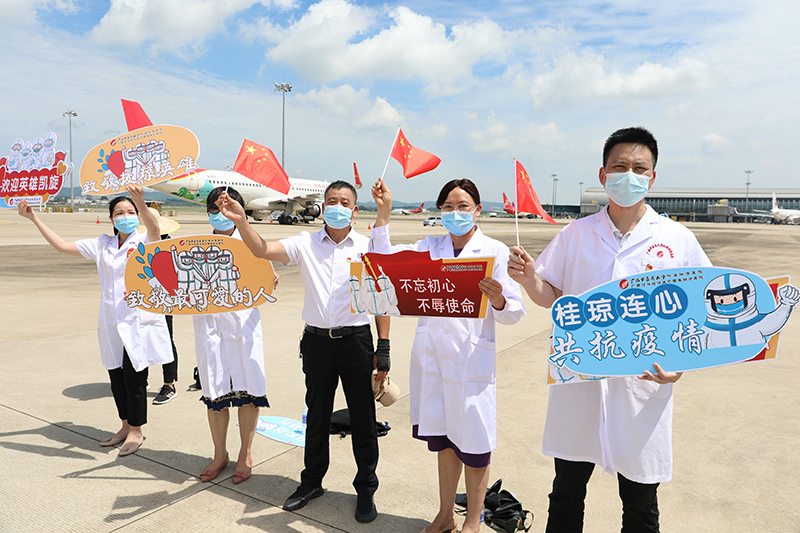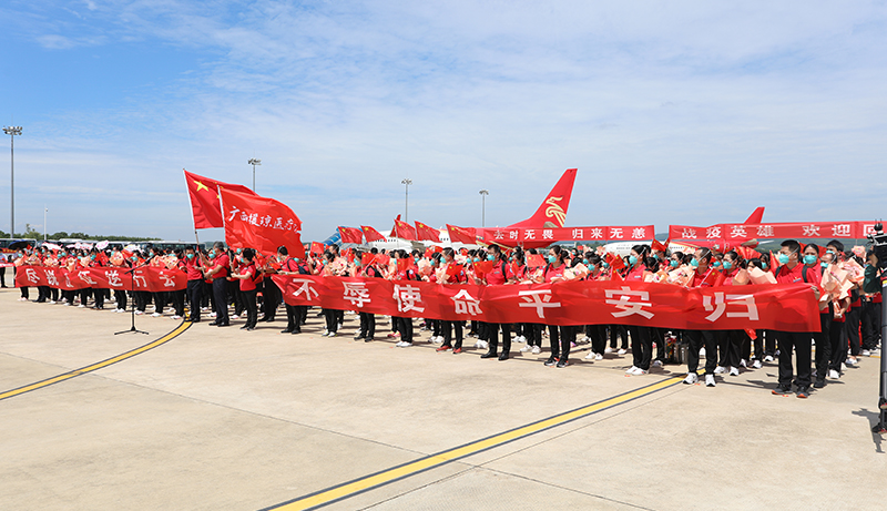 8月30日,第一批广西援琼医疗队526名医护人员结束20天的驰援工作,圆满完成任务,分乘4架航班,分别抵达南宁、柳州和桂林。上午11时10分左右,广西援琼医疗队在南宁吴圩国际机场平安落地,现场工作人员送上鲜花,欢迎白衣战士回家。