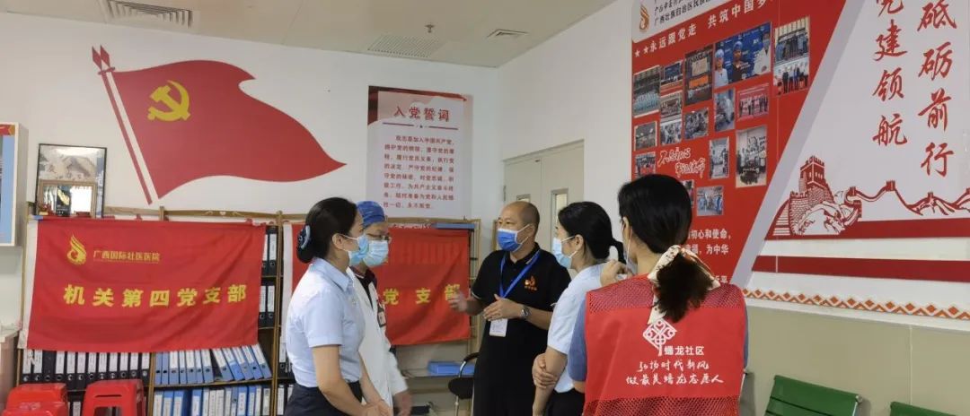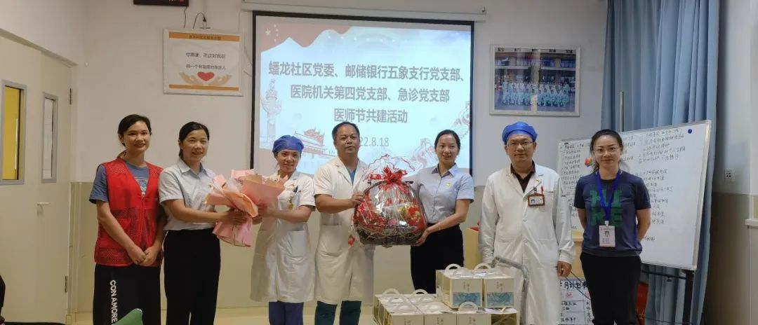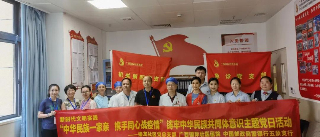 8月18日上午,附属国际壮医医院机关第四党支部与南宁市五象新区蟠龙社区党总支、邮储银行五象支行党支部共同开展“中华民族一家亲 携手同心战疫情”铸牢中华民族共同体意识主题党日活动,向坚守在抗疫第一线的生命守护者表达医师节的祝福及深深的敬意。