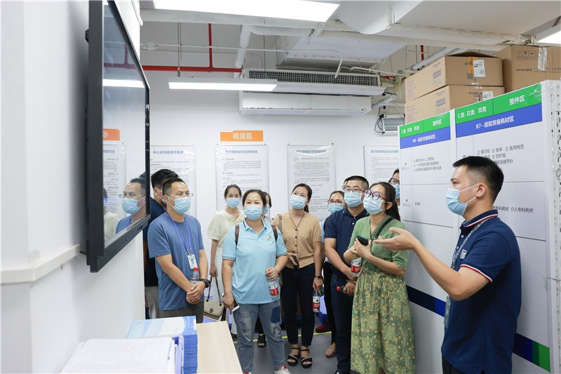 田东县中医医院的同仁们在仙葫院区的医疗耗材集中配送平台中心库,通过医疗耗材院内管理流程、院内医疗耗材规范管理的目标、院内智慧物流平台信息化系统、院内物流服务团队管理、医疗耗材院内监管流程等方面内容,详细了解了仙葫院区在医用耗材物流管理方面的经验,并实地考察了高值耗材智能柜、智能看板、智能回收柜等智能设备。